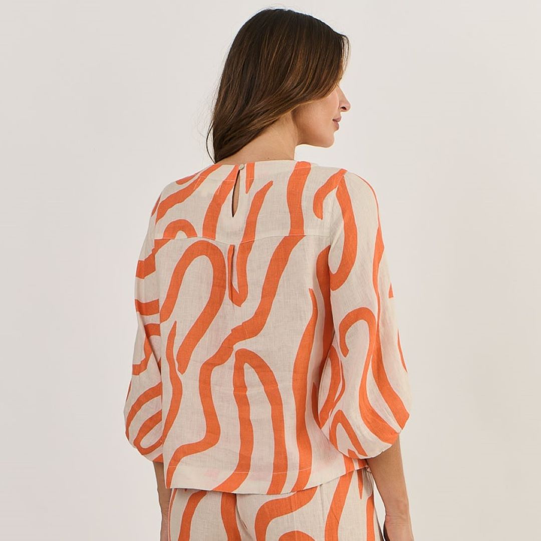 The Nikita Linen Top, in stunning Tamarind Ribbon design, is a relaxed fit with a midi balloon sleeve, and a round neckline. At the base of the neck, a small opening is fastened with a button at the back.