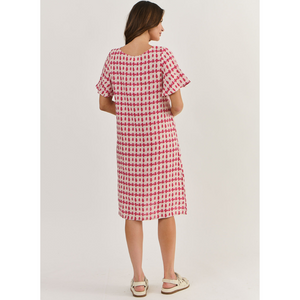 The Primrose is a lovely linen dress that features a flattering V-neck, a short subtly ruffly sleeve, and a hem designed to float at knee level.