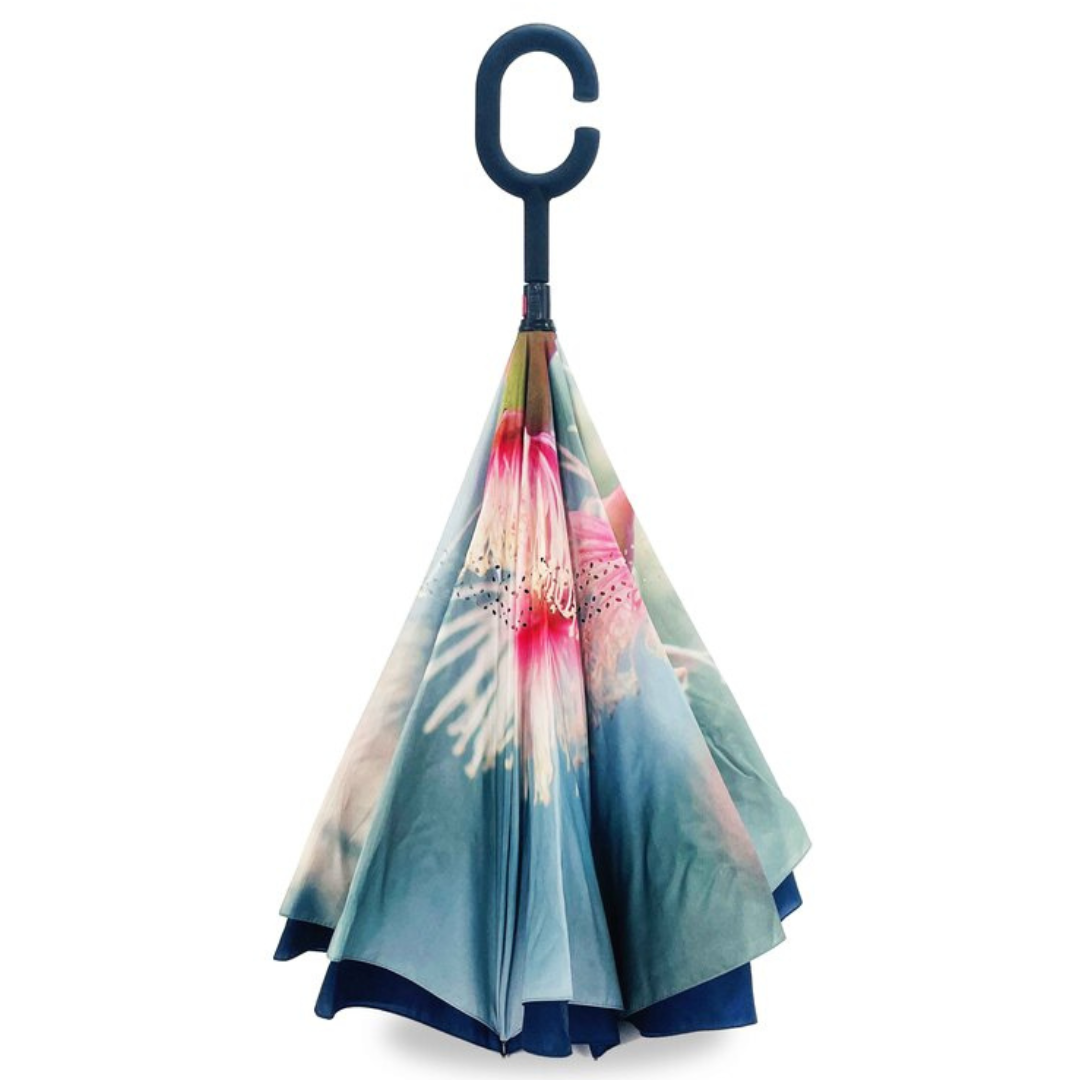 The Reverse Umbrella not only looks stunning with the designs on the outside when down and on the underside when in use, it has innovative features that make the traditional umbrella redundant: