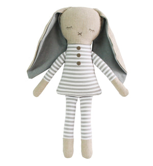 A sweet bedtime toy bunny featuring an asleep face on one side and an awake face on the other side.